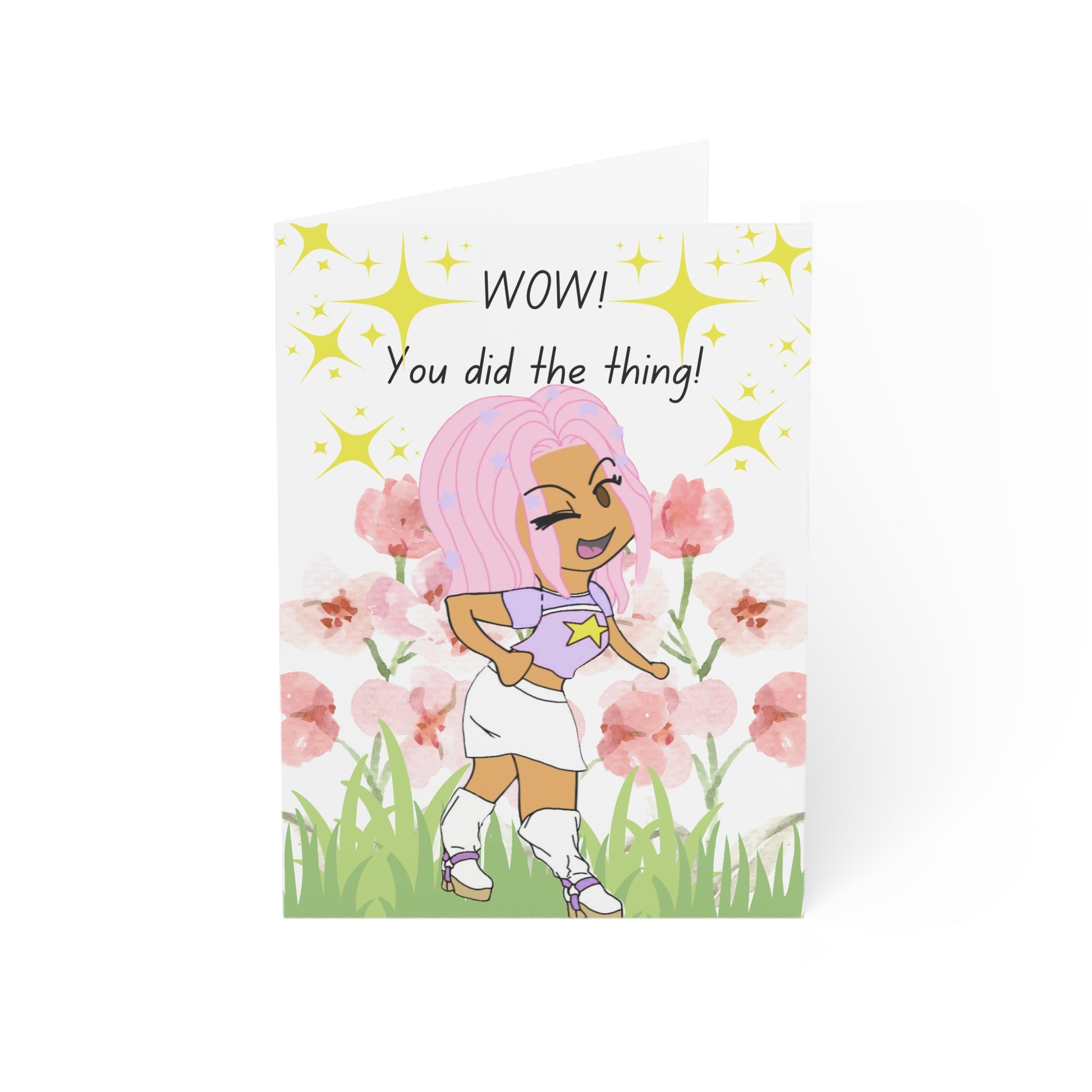 Personalized greeting cards featuring a cute character, known as Miss LightBrownPink, giving words of encouragement in a funny quote. Perfect for sending good wishes, congratulating someone, or just spreading positivity. Ideal for those who appreciate unique and colorful designs. Great for occasions like graduations, promotions, and achievements.