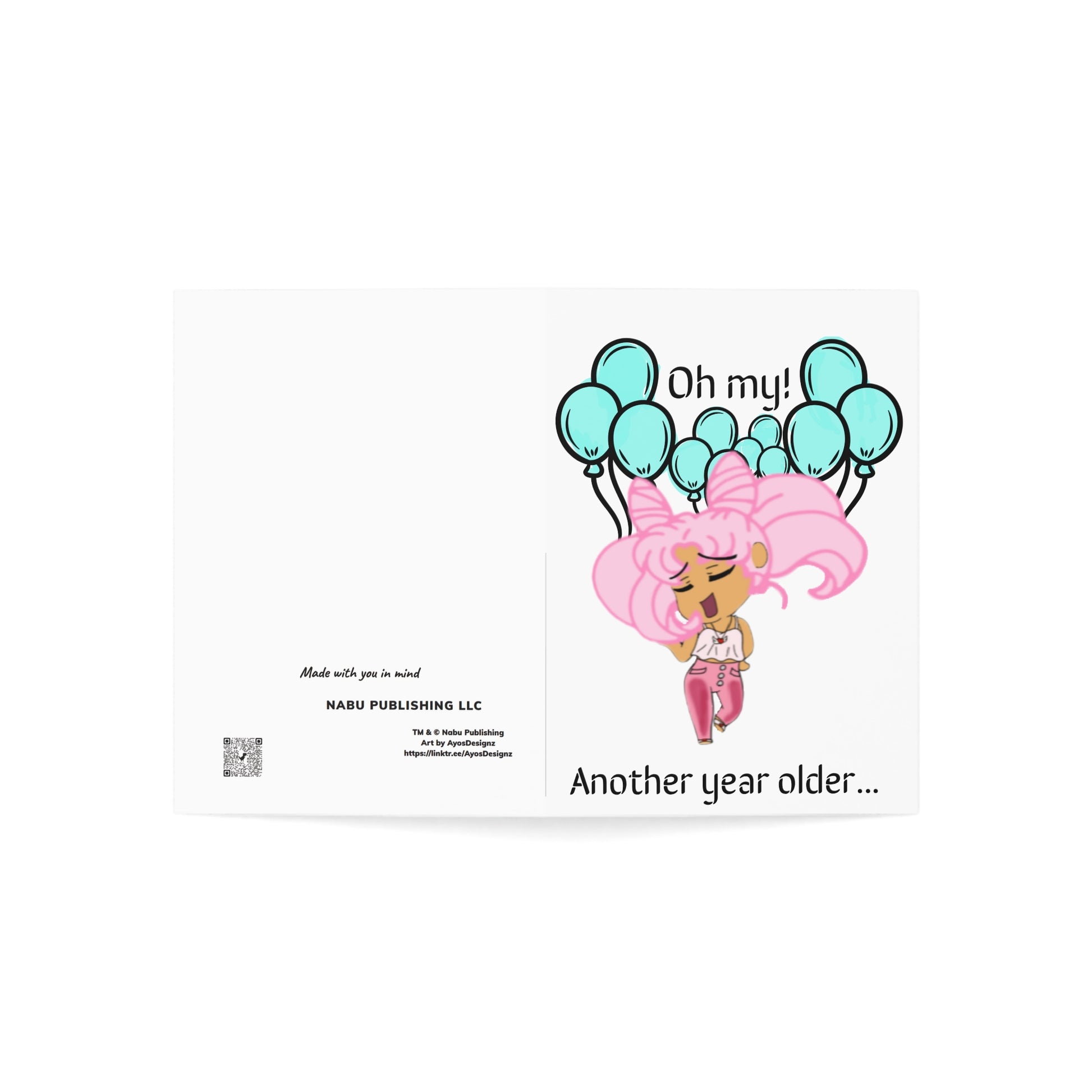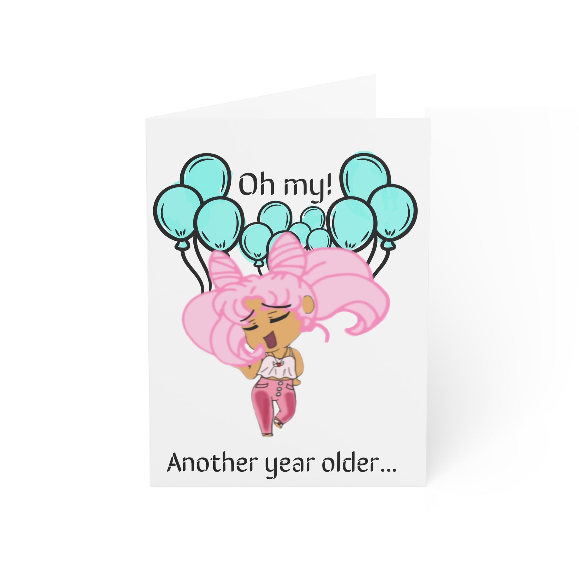 Vibrant and fun greeting card featuring Miss LightBrownPink in cosplay saying: "Oh my Another year older... meh you'll be fine." Perfect for those who appreciate unique and humorous cards or enjoy a good laugh. Relevant for birthdays, celebrations, and special occasions.